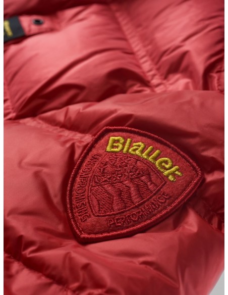 Característica trabilla Blauer cosida en el pecho a la izquierda y parche Blauer de paño en la manga.