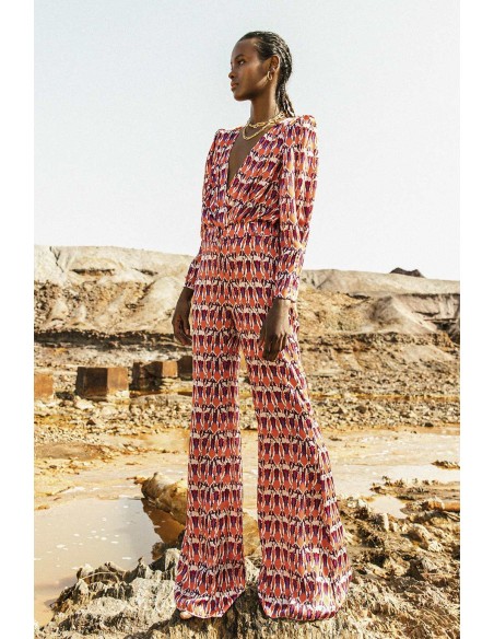 Pantalón campana realizado en un tejido de viscosa que destaca por su estampado tipo cenefa. Tiene detalle de trabillas en la cintura y bolsillos en la parte delantera. Es una prenda estrella que estiliza y sienta fenomenal a todo tipo de siluetas.