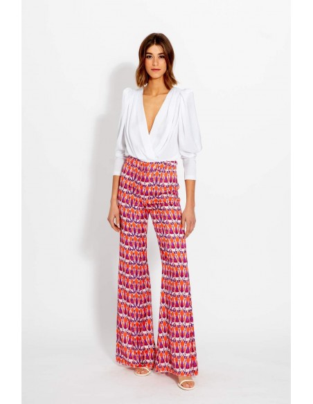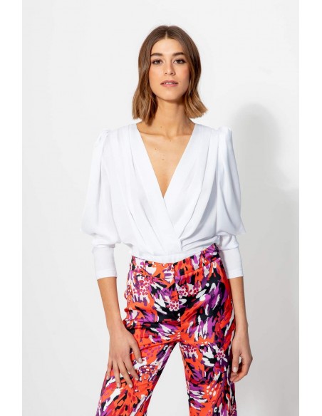 Blusa de manga larga, delantero cruzado y hombrera pequeña. Esta camisa destaca por su efecto drapeado y su sencillez lo que le permite ser combinada con cualquier pantalón o falda creando un estilo perfecto para cualquier evento.