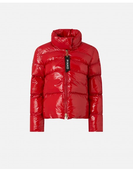 Plumífero acolchado tipo gabán, confeccionado en nailon cristal con un distintivo acabado brillante, adornado con un parche del logotipo Love Birds en una manga. Presenta un cuello alto cerrado al frente con botones a presión, mangas largas y bolsillos verticales de ribete en los laterales. El interior está forrado con tejido técnico. El cierre es de cremallera, con un tirador personalizado y cinta con logotipo.