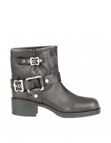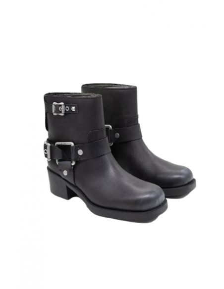 Elegante bota corta de estilo motero en cuero negro de primera calidad. Su diseño atemporal, con hebillas plateadas y puntera redondeada, las convierte en un básico imprescindible en cualquier armario. El tacón bajo y ancho garantiza comodidad durante todo el día, mientras que el forro interior de piel sintética ofrece suavidad y calidez. Perfectas para combinar con jeans ajustados y una chaqueta de cuero para un look rockero, o con un vestido floral para un contraste más femenino. Se recomienda limpiar con un paño húmedo y evitar el contacto con productos químicos.