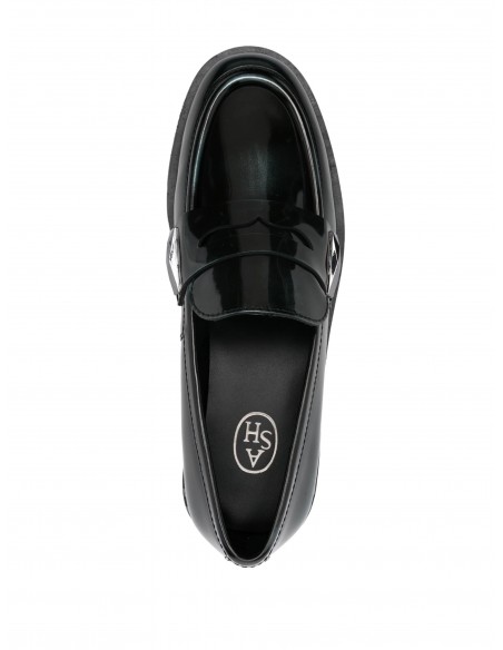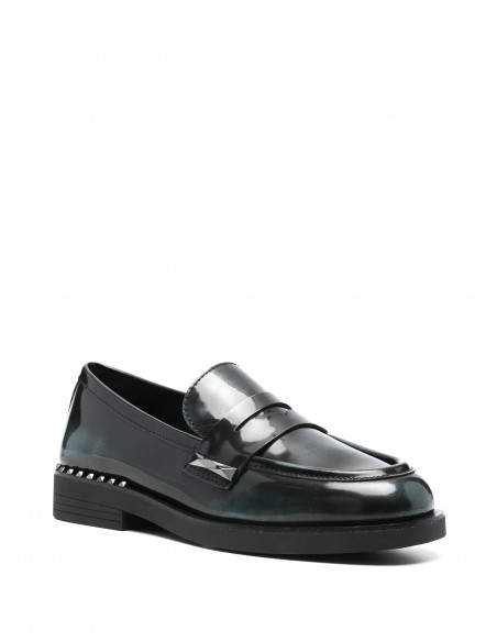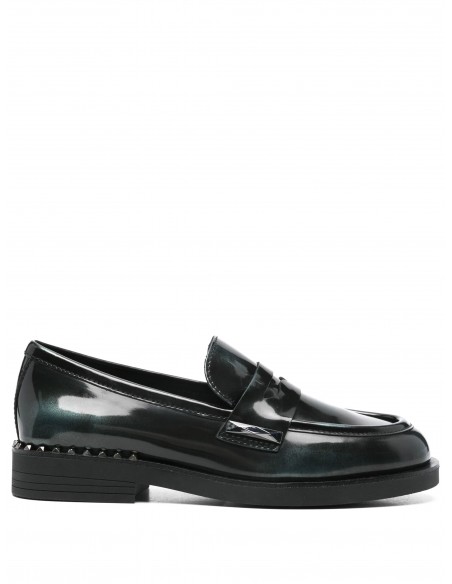 Este elegante mocasín Whisper Studs destaca por su distintivo color negro con reflejos azulados y por su acabado en piel pulida de becerro, ofreciendo un aspecto brillante y sofisticado. Su diseño clásico de corte bajo se complementa con detalles modernos como las tachuelas plateadas en el talón, que aportan un toque distintivo y contemporáneo.