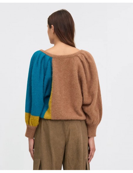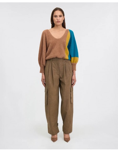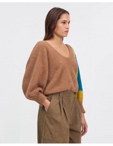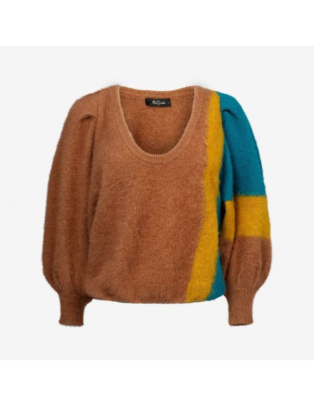 Opta por un look elegante y colorido con nuestro pequeño jersey corto de mezcla de lana en un tono camel atemporal. Los detalles de rayas en turquesa y ocre aportan un toque de dinamismo y modernidad a este jersey. Con un escote en V abierto y mangas 3/4, este jersey ofrece un corte holgado y cómodo, perfecto para un conjunto informal pero estiloso.