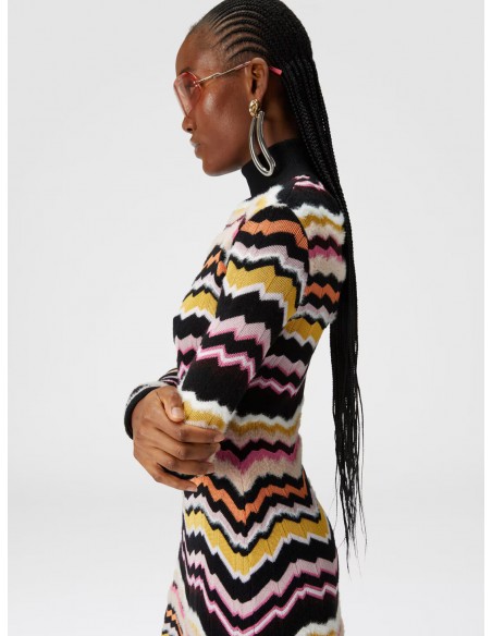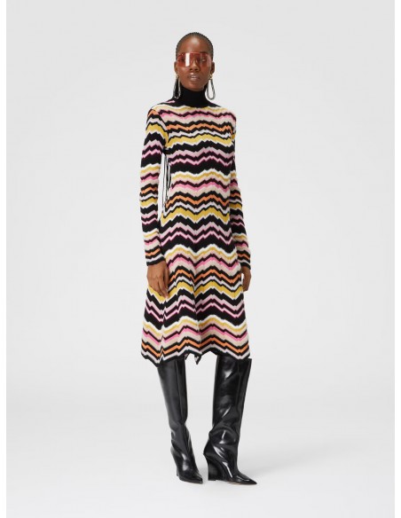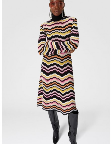 La alta costura de Missoni se reinventa para el día a día con este elegante vestido midi, adornado con el icónico motivo griego en zigzag. Confeccionado en una mezcla de hilo de lana y viscosa, este tejido suave proporciona una base perfecta para su diseño. Presenta un cuello alto que añade un toque de sofisticación y un dobladillo acampanado que aporta movimiento y fluidez al modelo. Este vestido midi es ideal para quienes buscan combinar estilo y comodidad en su guardarropa.