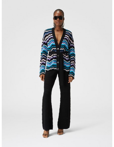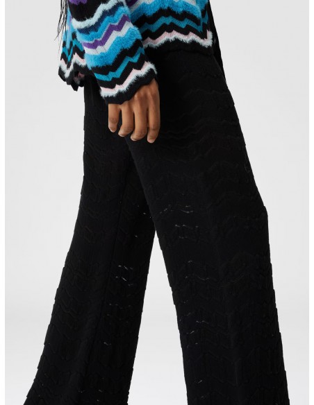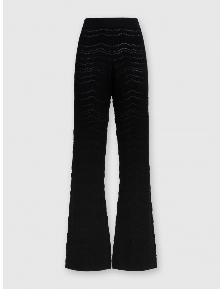 Estos pantalones acampanados destacan por su elegante patrón en zigzag tono sobre tono, que aporta un sutil dinamismo al tejido de viscosa y lana. El diseño cuenta con una cintura elástica para mayor comodidad y un dobladillo liso que completa su estilo fluido y sofisticado. Con su corte pantapalazzo, estos pantalones son la combinación perfecta de modernidad y elegancia, ideales para un look distintivo y con estilo.