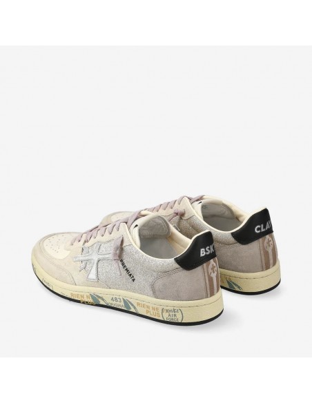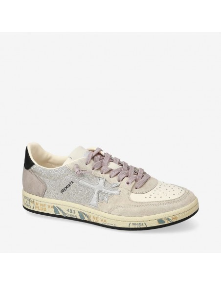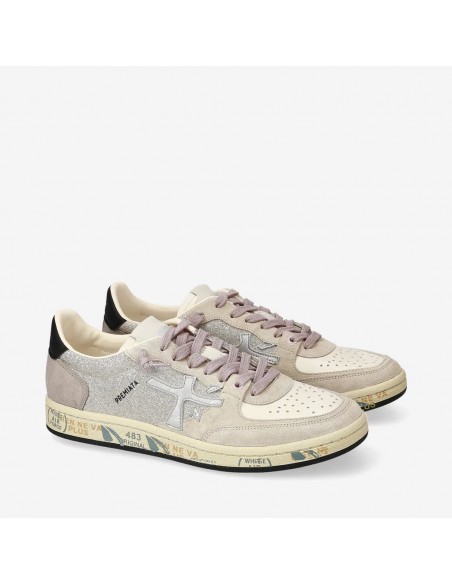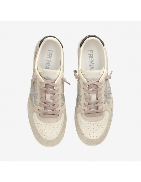 Estas sneakers Premiata presentan un diseño moderno y distintivo, ideal para un look urbano. Confeccionadas en una combinación de materiales de alta calidad, destacan por su cuero con efecto desgastado y detalles en ante. La parte superior cuenta con un logotipo de Premiata en el lateral, realzado con detalles metálicos y costuras cuidadas. La suela, decorada con un diseño gráfico en tonos beige y azul, ofrece una excelente tracción y comodidad. Los cordones, en un tono a juego, añaden un toque de cohesión al diseño. El talón en contraste y el acolchado en el interior garantizan un ajuste cómodo y seguro.