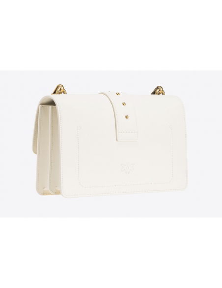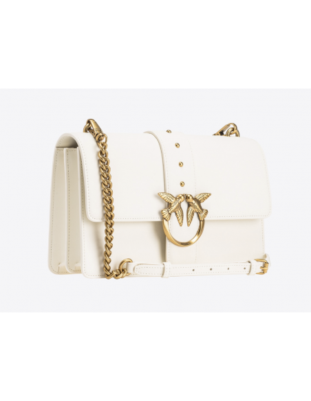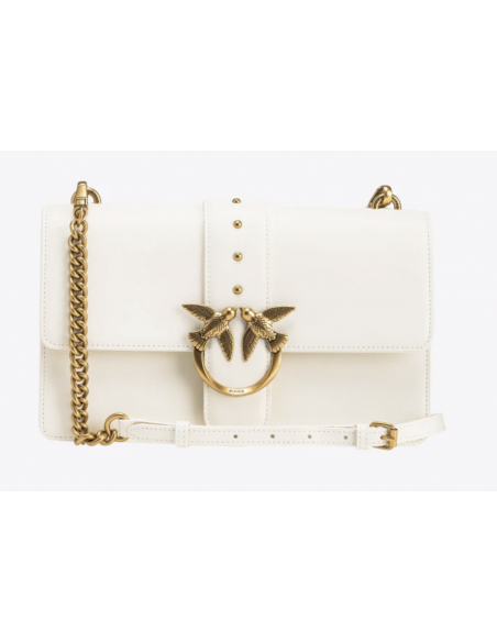 Bolso Classic Love Bag One confeccionado en piel suave con un acabado sedoso. El cierre de pasador con detalles en piel y tachuelas se complementa con la icónica hebilla metálica Love Birds Diamond Cut. El interior, forrado en microfibra con efecto ante, cuenta con un panel divisorio con cierre de cremallera y un bolsillo interno de piel. La correa extraíble combina una clásica cadena redonda con una hombrera de piel ajustable.