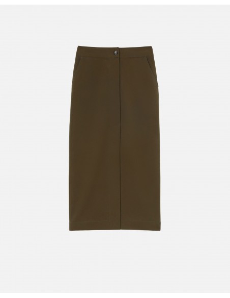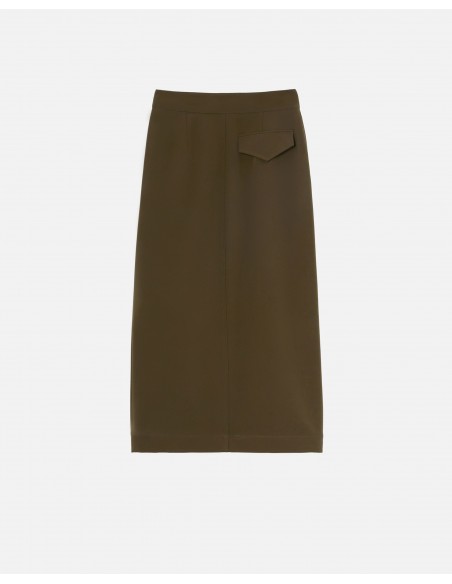 Falda larga de estilo utilitario con un corte recto, confeccionada en un tejido fluido de viscosa técnica elástica. Incluye bolsillos franceses en los laterales, un falso bolsillo con solapa de punta en la parte trasera, y una abertura central en el dobladillo frontal. Se cierra con una cremallera y un botón a juego.