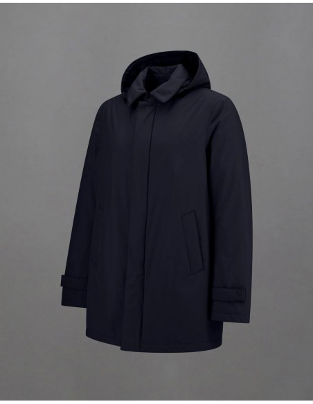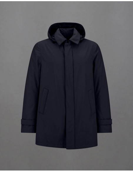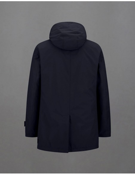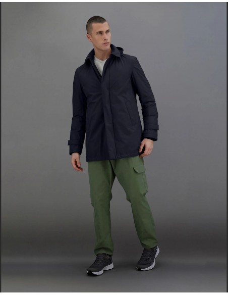 Con un corte slim, cuello de camisa y capucha extraíble, ofrece un diseño moderno y versátil. Forma parte de la colección Herno Laminar Sartorial Engineering, que combina tecnología avanzada con un enfoque clásico, ideal para el hombre moderno.