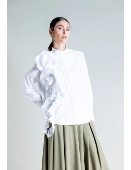 Descubre nuestra elegante camisa de popelín con cuello mao y manga larga, diseñada para quienes aprecian la sofisticación con un toque moderno. Su detalle distintivo es una gran flor rodeada de volantes en cascada lateral, que aporta un aire único y refinado. Con puños de doble botón, esta prenda ofrece una combinación perfecta de confort y estilo, ideal para cualquier ocasión en la que se busque destacar con elegancia.