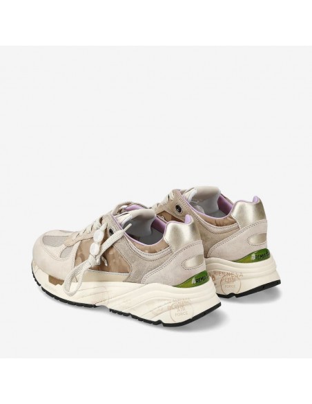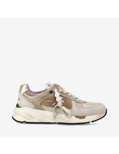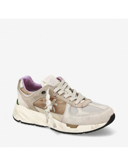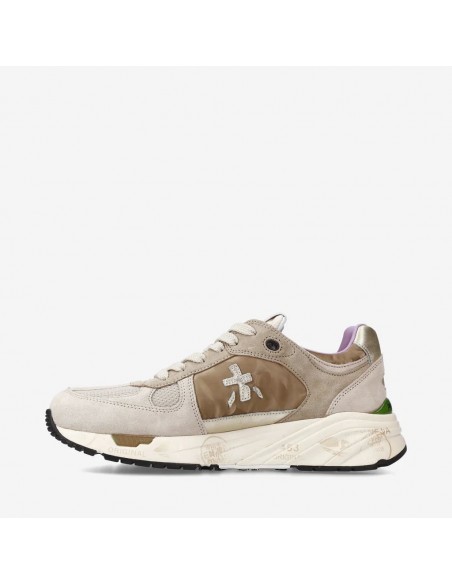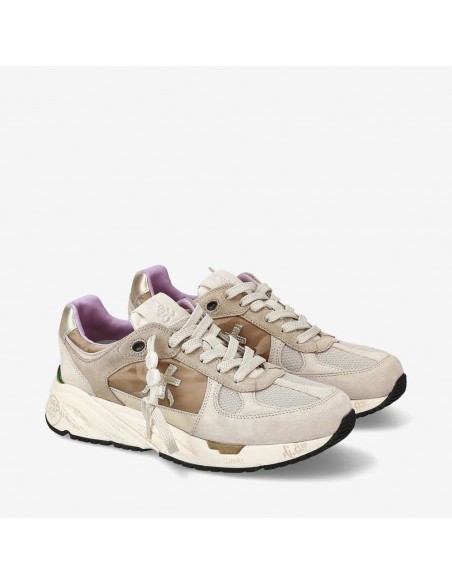 Una combinación perfecta de estilo y comodidad. Estas zapatillas están confeccionadas en piel de becerro en una elegante combinación de tonos grises y blancos, con un diseño panelado que resalta su estética moderna y llamativa. El logo de la marca adorna uno de los laterales, añadiendo un toque distintivo y de lujo. El cierre de cordones en la parte delantera te proporciona un ajuste seguro y personalizado.