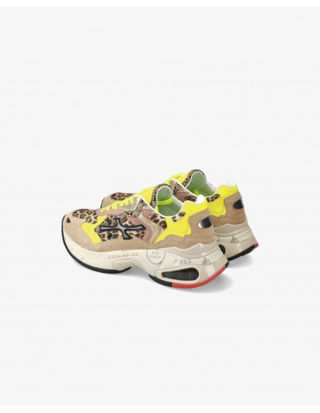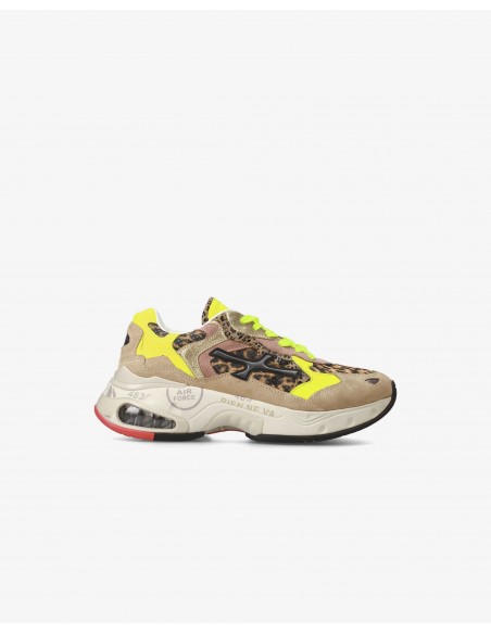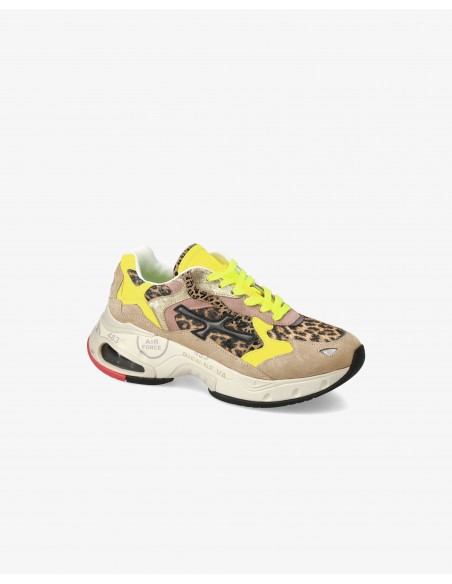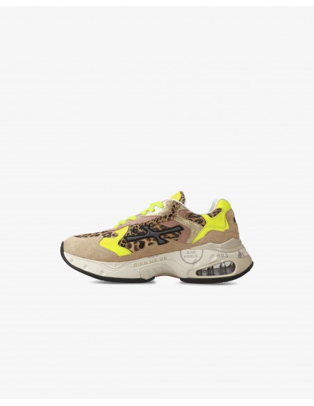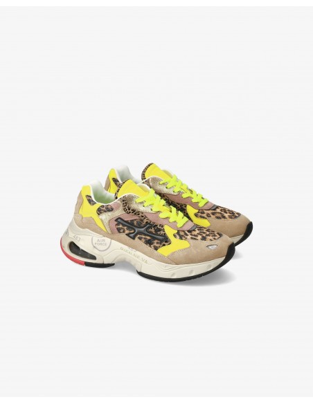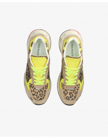 Zapatillas Premiata con un diseño único que combina estampado animal y detalles en neón. Confeccionadas en una mezcla de materiales de alta calidad, destacan por sus detalles en amarillo flúor y cordones a juego que aportan un toque llamativo. La suela robusta garantiza comodidad y estilo, haciendo de estas deportivas una elección ideal para quienes buscan destacar con cada paso.