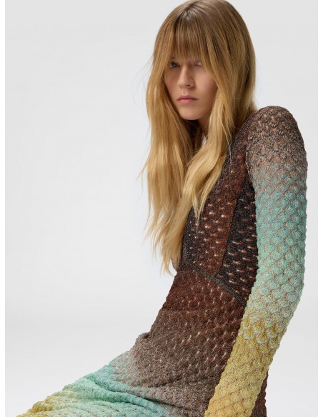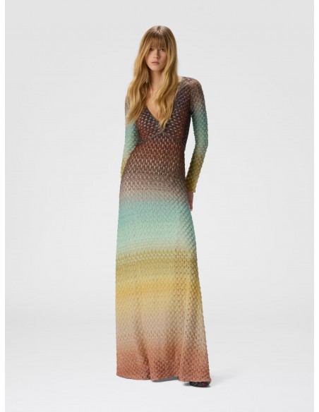 El vestido largo degradado de Missoni es una expresión de elegancia y sofisticación atemporal. Su silueta acampanada y femenina se ve realzada por un escote en V que aporta un toque sensual y equilibrado. Confeccionado en una mezcla de viscosa con filamentos de lamé, este vestido deslumbra por su acabado degradado que capta la luz y el movimiento. El encaje Raschel añade textura y profundidad, envolviendo la prenda en una estética refinada que combina tradición artesanal con modernidad. Perfecto para ocasiones especiales, este vestido realza la figura con ligereza y fluidez.