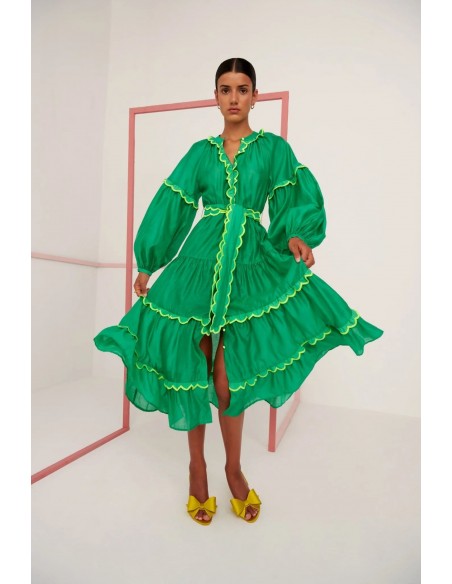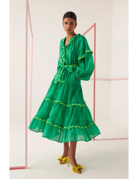 El Flame Dress Green de Celia B es uno de los favoritos de temporadas pasadas que regresa en una versión aún más encantadora. Este vestido largo se presenta en un verde bosque intenso, realzado por detalles en verde lima con bordes festoneados que aportan un toque distintivo y artesanal.