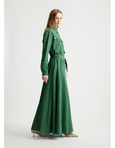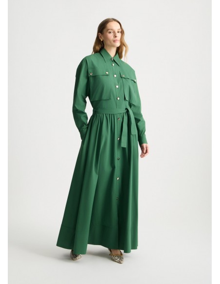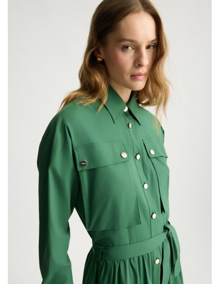 Este vestido camisero largo de Liu Jo combina estilo funcional y feminidad en una silueta fluida y favorecedora. Confeccionado en algodón 100%, destaca por su color verde vibrante y su diseño estructurado con cuello camisero, cierre frontal completo con botones y dos bolsillos con solapa y botón a la altura del pecho.