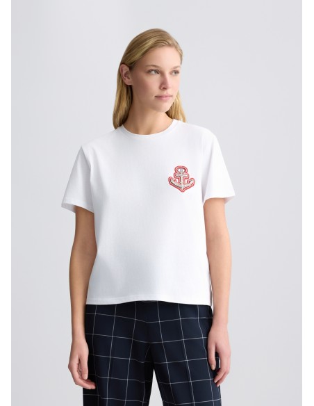 El bordado gráfico en el pecho, realzado con delicadas aplicaciones de strass, añade un brillo sutil y un guiño chic a este diseño casual. El escote redondo y las mangas cortas garantizan una silueta atemporal y fácil de combinar.