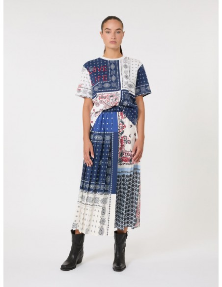Una pieza sofisticada y con un toque bohemio. La Falda Luna de Max Mara está elaborada en un ligero tejido de twill con estampado bandana, que aporta movimiento y frescura a cada paso. Su diseño acampanado se realza gracias a un panel ajustado adornado con pliegues, que define la silueta de forma elegante y femenina.