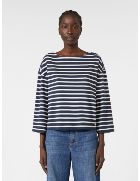 La Camiseta Rayas Campale de Max Mara es una prenda esencial con un diseño contemporáneo y responsable. Confeccionada en jersey interlock de 100% algodón procedente de cultivos orgánicos, destaca por su tacto suave y estructura definida. Su corte boxy y el cuello barco ofrecen una silueta moderna, mientras que las mangas largas con hombros caídos aportan un estilo relajado. El pequeño logo de mariposa bordado en el lateral añade un toque sutil de identidad. Ideal para combinar con prendas de sastrería o denim para un look equilibrado entre comodidad y elegancia.
