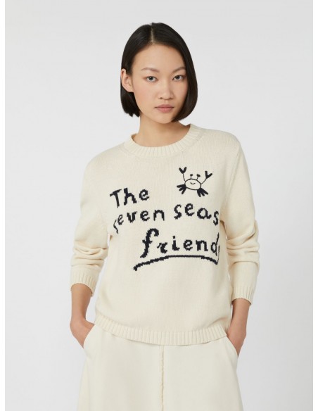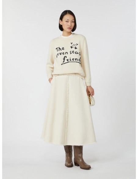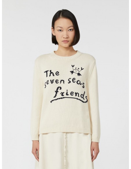 El Jersey Nespola de Max Mara combina calidad, confort y un diseño atemporal con un toque distintivo. Confeccionado en un hilo cordonnet mezcla de algodón (90%) y poliéster (10%), destaca por su textura ligera y su caída suave. Presenta un ajuste regular, cuello redondo clásico, mangas largas montadas y acabados acanalados. El motivo gráfico incrustado en el frontal —inspirado en la colección— aporta personalidad sin perder elegancia. Un básico elevado, ideal para looks casuales o de oficina.