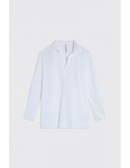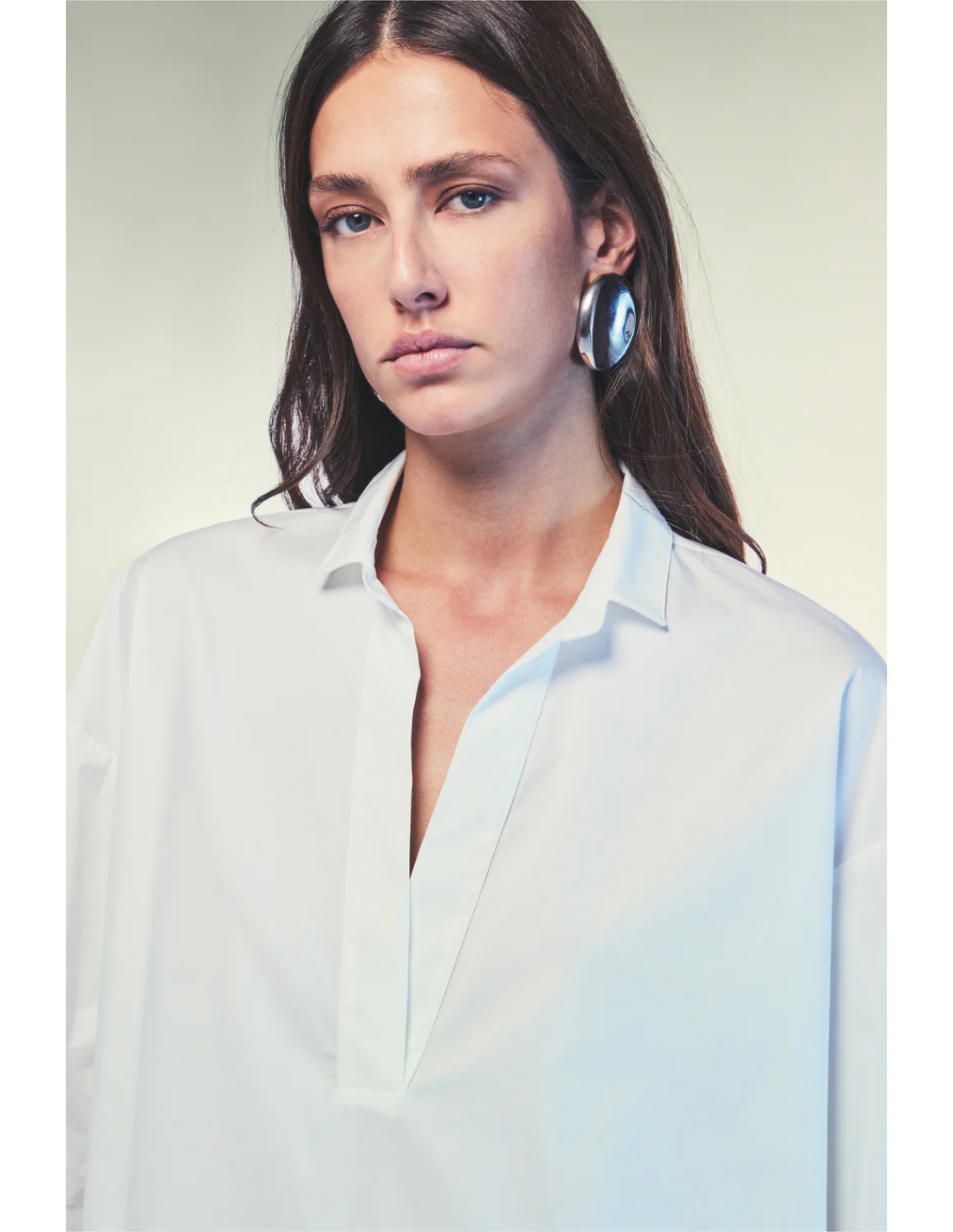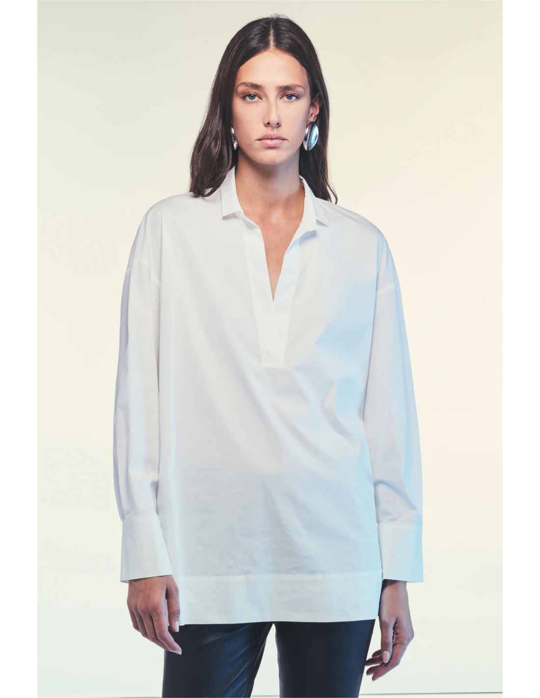 La blusa Dasia de Liviana Conti destaca por su silueta oversize tipo boxy, confeccionada en lienzo de algodón con mezcla elástica, que aporta estructura y libertad de movimiento a partes iguales.