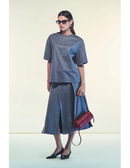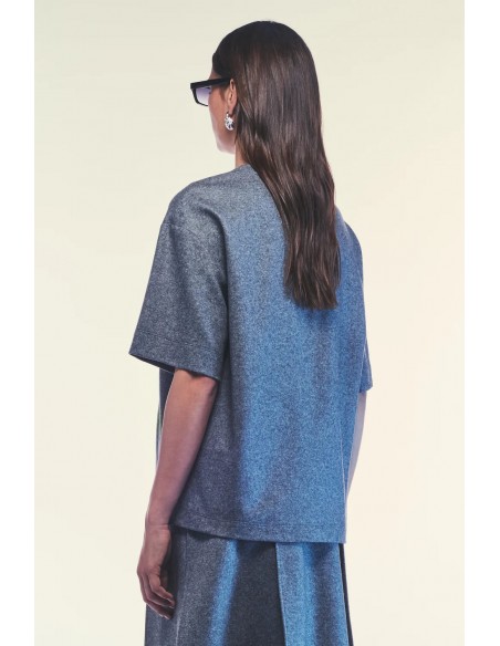 Su diseño oversize con mangas cortas, escote redondo y aberturas laterales en el bajo aporta movimiento y una silueta relajada, mientras que el largo a la altura de la cintura alta estiliza la figura sin perder comodidad. Perfecto para combinar con pantalones de tiro alto, faldas midi o incluso como capa ligera sobre prendas ajustadas.