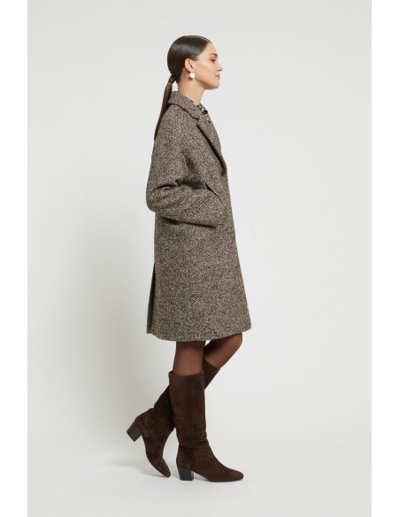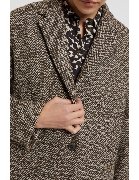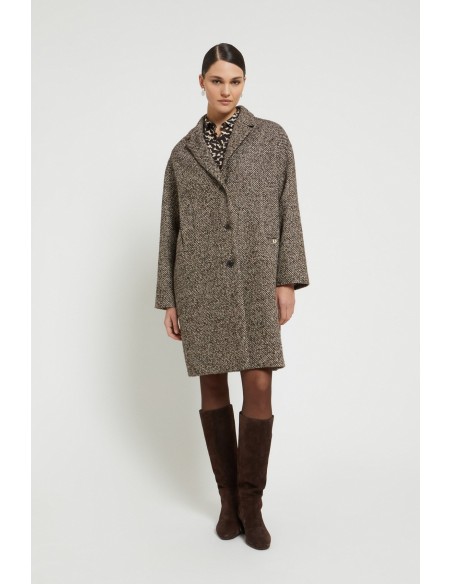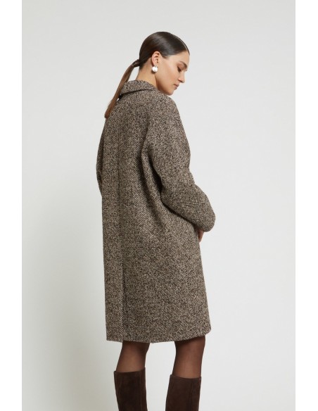 El Abrigo Midi Melange de Ottod’Ame es una prenda imprescindible para el armario de otoño-invierno. Confeccionado en un tejido melange de mezcla de fibras que aporta textura y riqueza visual, cuenta con cierre frontal de tres botones y una abertura trasera que favorece el movimiento y estiliza la figura.