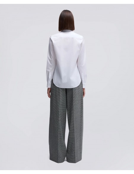 Presenta un diseño de manga larga con puños abotonados, bajo redondeado para un ajuste natural sobre pantalones o faldas, y canesú en la espalda que mejora el confort y la caída del tejido. El cierre frontal con botones mantiene la estética limpia y depurada característica de Aspesi.