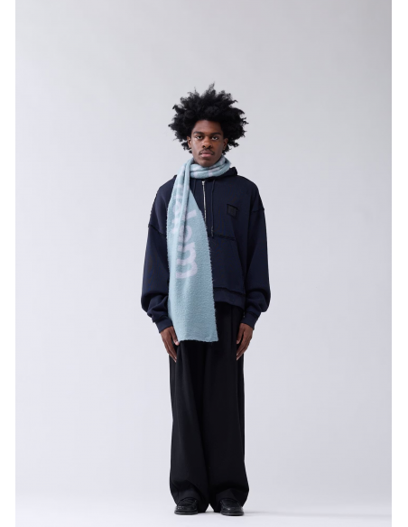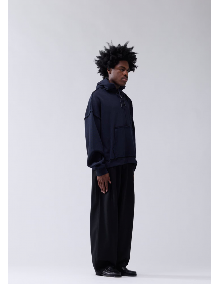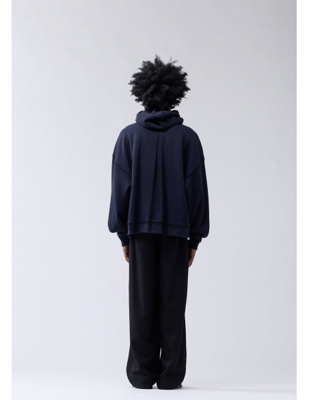 Su media cremallera metálica permite un ajuste versátil, mientras que los cordones de goma con marca, la etiqueta tejida tonal en el pecho y los acabados sin rematar aportan un aire desenfadado y contemporáneo. El pliegue central en la espalda añade un detalle de sastrería casual.