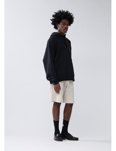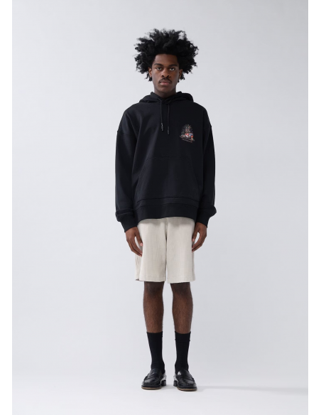 El gran protagonista es su obra gráfica de temporada “Buffet”, creada con una técnica exclusiva: primero se borda completamente el diseño y después se imprime sobre él, logrando una textura y profundidad únicas. Los detalles como cordones con puntas de goma, capucha ajustable y puños y bajo de canalé refuerzan su estética urbana y contemporánea.