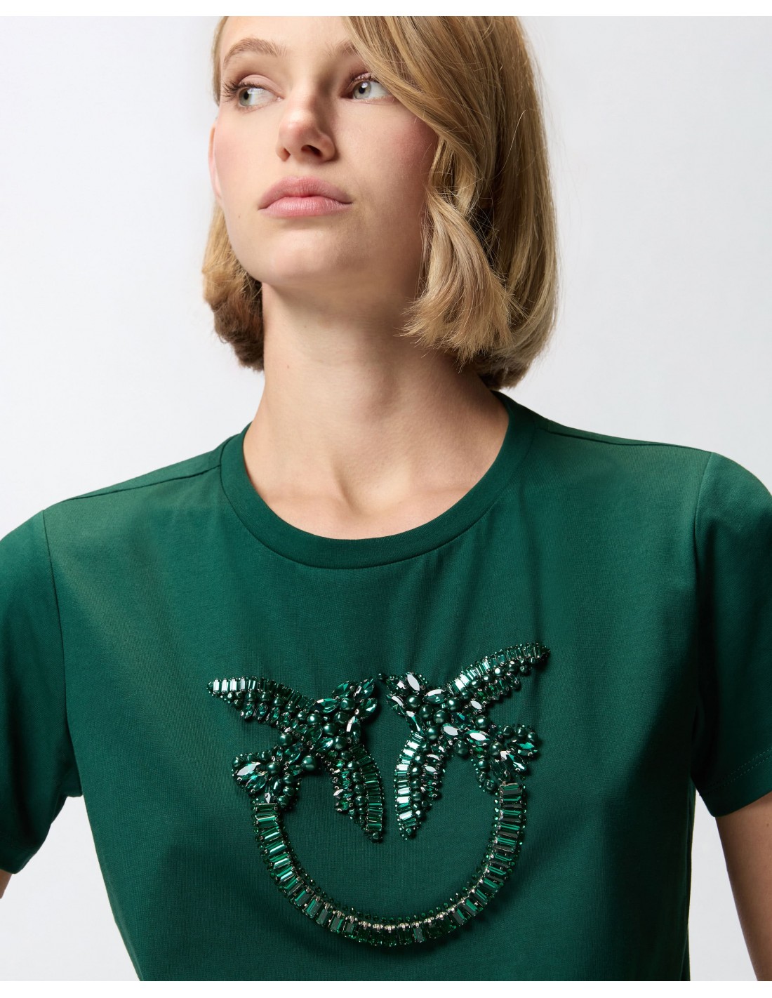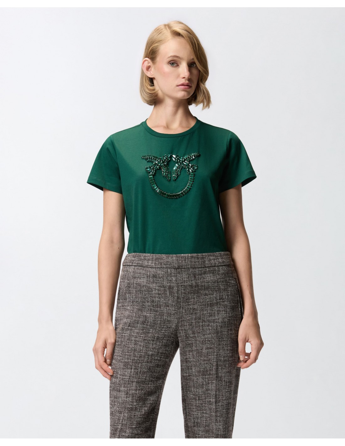 La Camiseta Love Birds de Pinko es un básico con un toque icónico y femenino. Confeccionada en punto de algodón de alta calidad, presenta el logotipo Love Birds decorado con bordado a mano, combinando perlas, cadenitas de cristales tipo baguette y strass de distintas formas, fijados con aletas especiales para mayor durabilidad. Esta camiseta une elegancia y versatilidad, siendo perfecta para looks formales o deportivos, aportando siempre un detalle sofisticado y distintivo. Su corte clásico y cómodo permite combinarla con pantalones, faldas o jeans, convirtiéndola en una prenda clave del armario contemporáneo.