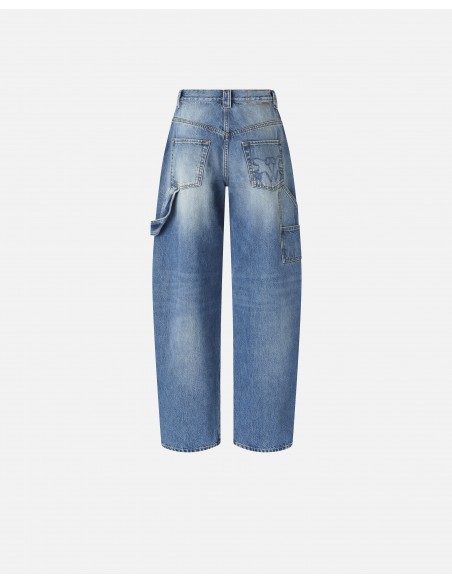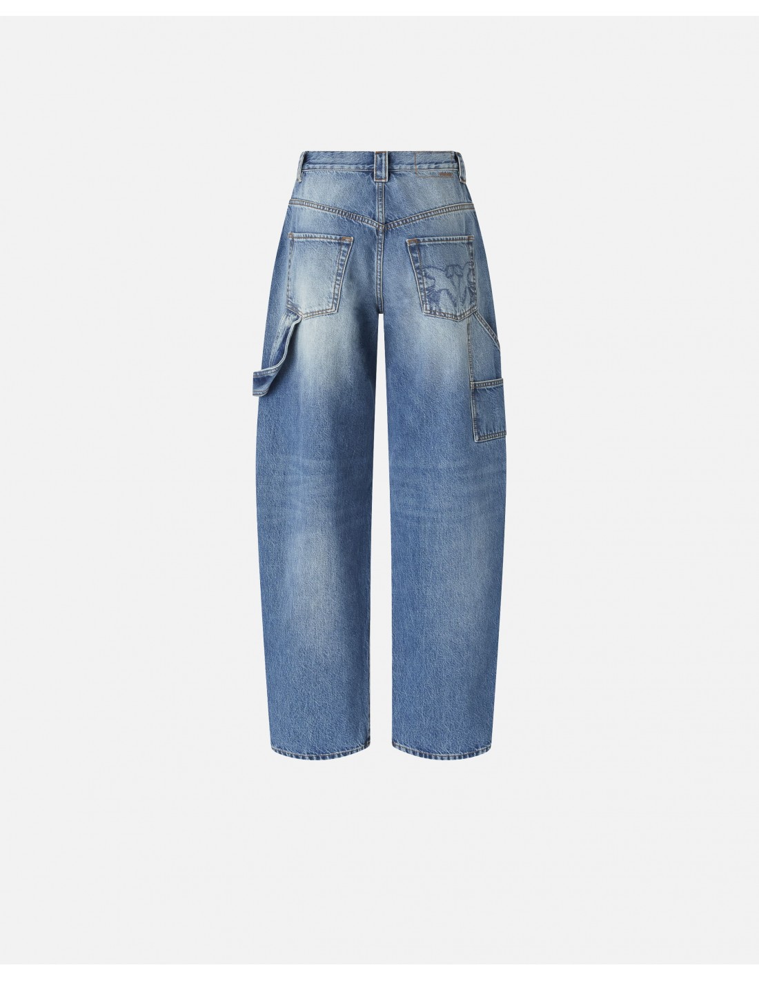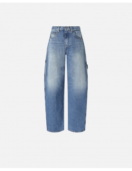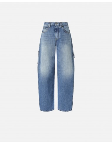 Los Vaqueros globo con detalles workwear de Pinko combinan diseño moderno y estilo clásico. Con pernera amplia y redondeada en la parte superior, estrechándose en el bajo, ofrecen un balloon-fit cómodo y favorecedor. Confeccionados en denim azul de algodón y tratados con técnicas especiales que crean un efecto vintage con contrastes de color, estos vaqueros incluyen cinco bolsillos, un doble bolsillo en una pernera y correa trasera en la otra, cierre con cremallera y botón metálico. Los detalles característicos de Pinko incluyen el logotipo bordado en la cintura, el Love Birds con pajaritos en el bolsillo trasero derecho y el remache con logotipo Love Birds en el quinto bolsillo. Perfectos para un look casual o inspirado en el workwear.