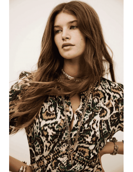El vestido Onoa de Ba&sh combina elegancia y estilo boho con un corte al sesgo que favorece la silueta. Presenta mangas tres cuartos, un cinturón étnico bordado que marca la cintura y un delicado estampado que aporta un toque distintivo. El escote en forma de gota permite distintas opciones de cierre: se sugiere abrochar únicamente el primer gancho del cuello y dejar abierto el inferior para un look más relajado.
