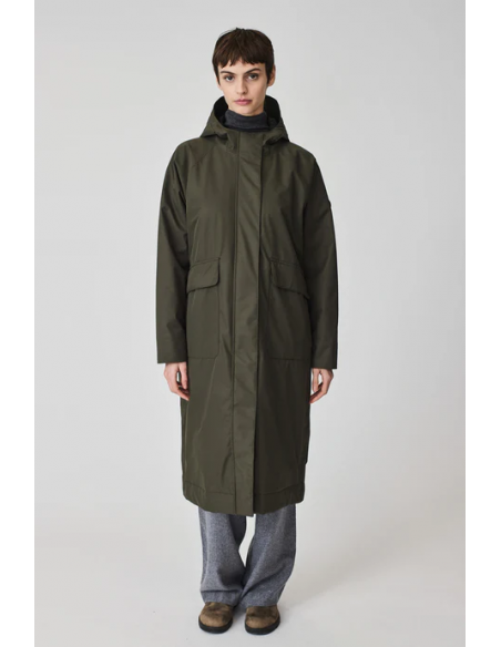 El abrigo Torm Khaki de Tanta está confeccionado en tejido Twill impermeable con costuras totalmente selladas que garantizan una protección superior frente al frío y la humedad. Su diseño acolchado presenta un corte oversize tipo capa, moderno y sofisticado, que combina estilo y funcionalidad. El aislamiento ligero y transpirable, sin plumas, mantiene el calor corporal. Las mangas raglán, los bolsillos plastrón con solapa y apertura lateral con cremallera impermeable, junto con los cierres magnéticos, aportan un aire práctico y minimalista.