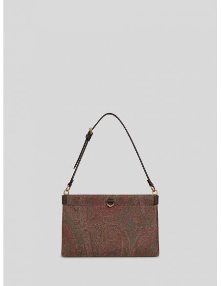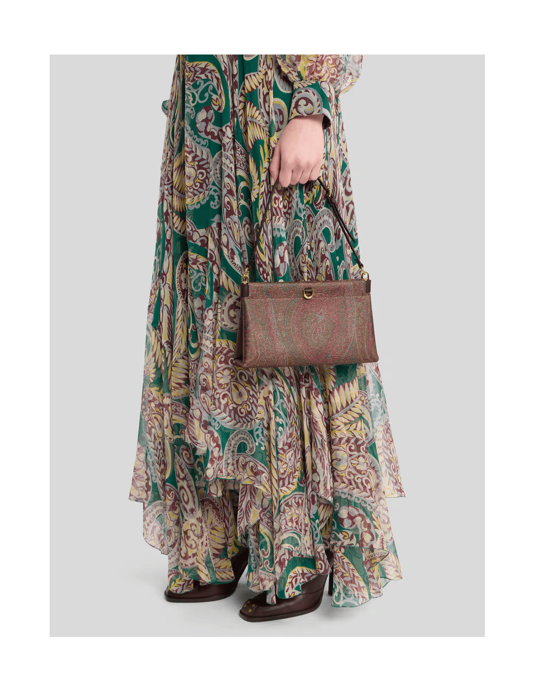 El Clutch Talk Mini de Etro, presentado en el desfile otoño-invierno 2025, es una pieza icónica diseñada en el inconfundible tejido jacquard Paisley de la firma. Compacto, elegante y muy funcional, cuenta con un cierre superior magnético que se acciona a través de sus anillas metálicas exteriores, aportando un toque distintivo y sofisticado al diseño.