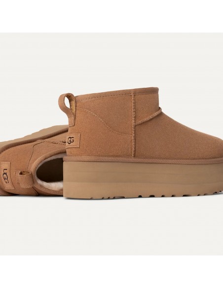 Las UGG Classic Ultra Mini Plataforma Chestnut son la versión más moderna y viral del icónico diseño UGG. Con su caña ultrabaja de 8,9 cm y una plataforma de 5 cm, reinventan el clásico con un toque contemporáneo sin perder la comodidad característica de la marca.