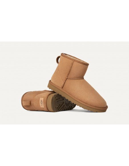 Las UGG Classic Mini II Chestnut para mujer son una versión icónica y versátil de la clásica bota de la marca, inspirada en los surfistas que buscaban calidez tras sus sesiones. Este modelo presenta un diseño de caña baja (13,9 cm de altura), ideal para looks informales y urbanos, desde vaqueros boyfriend hasta vestidos relajados.