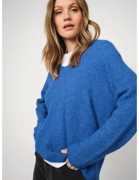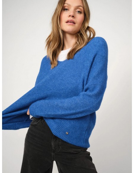 El Jesey MMThora Azul de Mos Mosh es un básico atemporal pensado para acompañarte temporada tras temporada. Confeccionado en una mezcla ligera de alpaca y lana, ofrece suavidad, abrigo y un toque de lujo natural. Su escote en V profundo y favorecedor, junto con los hombros caídos, aportan un aire relajado y femenino que se adapta a múltiples estilismos.