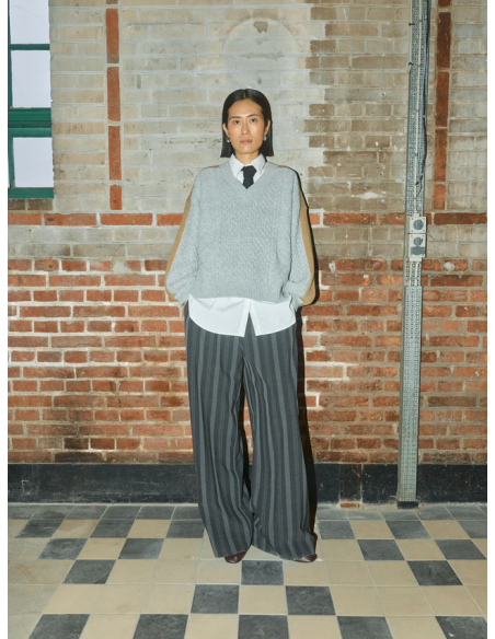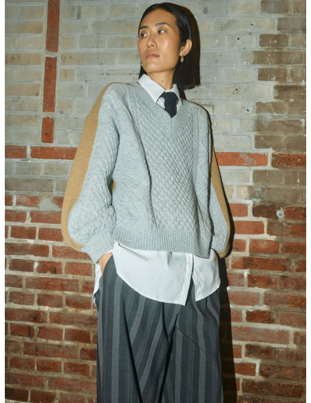 Su diseño juega con la textura y el contraste: un patrón estructurado de ochos en la parte delantera y un tejido liso en la espalda, creando un efecto sofisticado y moderno. Los detalles acanalados en el escote en V, puños y dobladillo refuerzan su carácter atemporal.