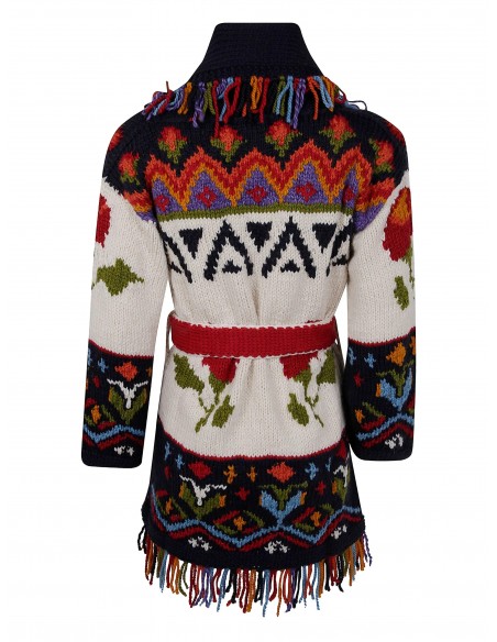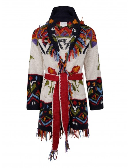 Su diseño destaca por su ribete de flecos multicolor, cinturón rojo que define la silueta, motivos geométricos y bolsillos de parche funcionales, aportando un toque bohemio y sofisticado a la vez. La base en blanco roto permite que los detalles de color resalten con elegancia, haciendo que cada prenda sea una pieza de arte textil.