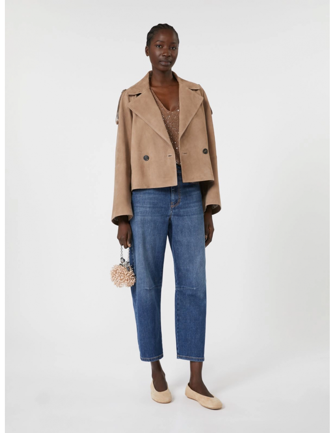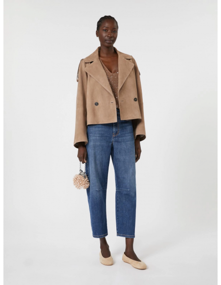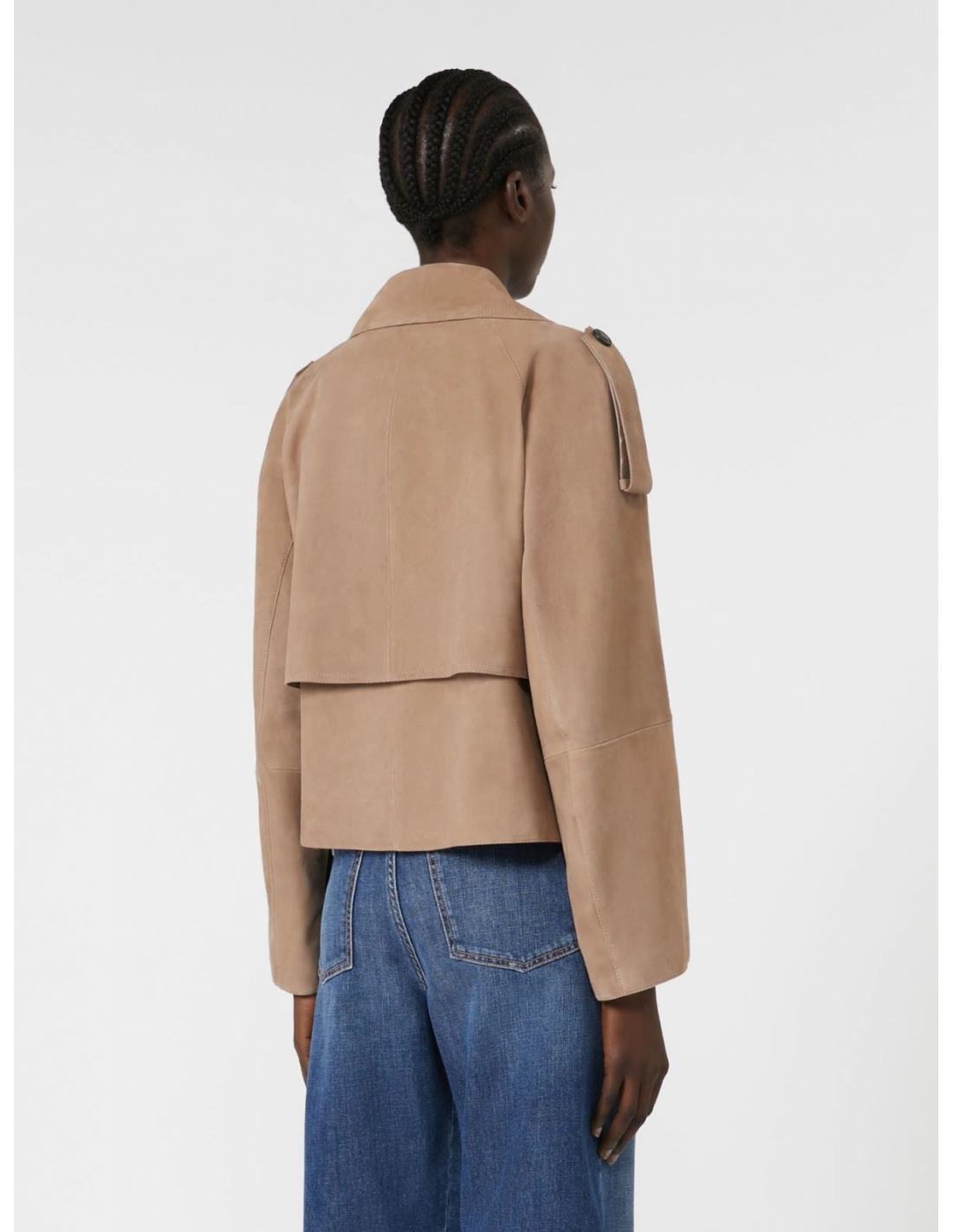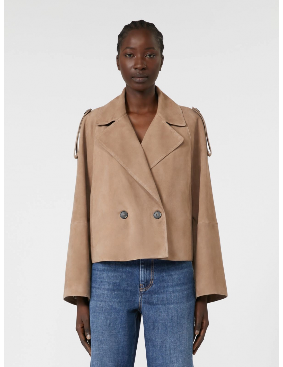 La Chaqueta Ante Maga de Max Mara es una reinterpretación sofisticada del trench clásico en versión corta. Confeccionada en ante suave de cordero, combina tradición y modernidad con detalles icónicos como las charreteras en los hombros y la capa de lluvia superpuesta. Su corte recto y el amplio cuello de solapa aportan un aire refinado, mientras que las mangas raglán largas garantizan comodidad y libertad de movimiento. El cierre cruzado con botones efecto cuerno realza su carácter atemporal, acompañado de bolsillos laterales en costura para mayor funcionalidad. Está totalmente forrada en poliéster, asegurando confort y durabilidad.