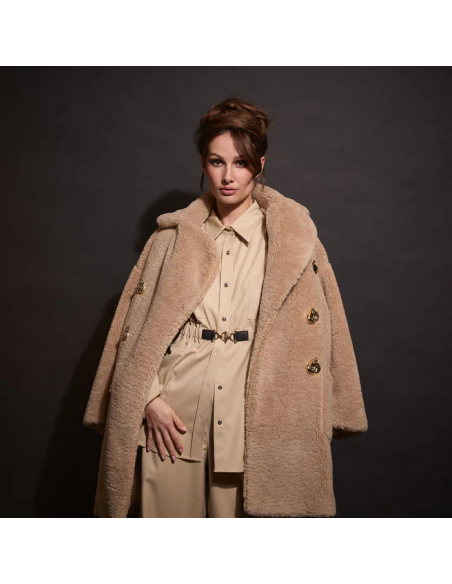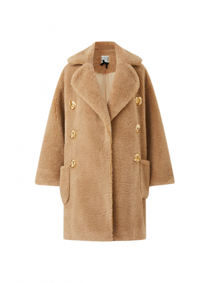 El abrigo se cierra con botones joya dorados que aportan un toque de sofisticación y elegancia, elevando el diseño clásico del teddy a un look moderno y refinado. Su corte holgado permite comodidad sin sacrificar estilo, ideal para combinar con prendas urbanas o más formales en días fríos.