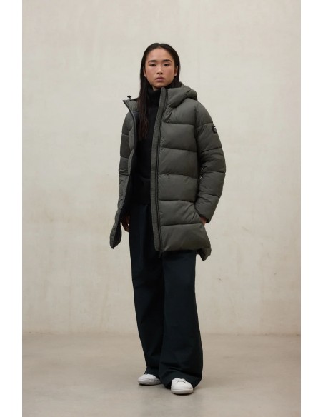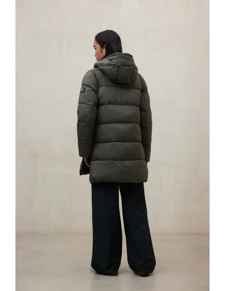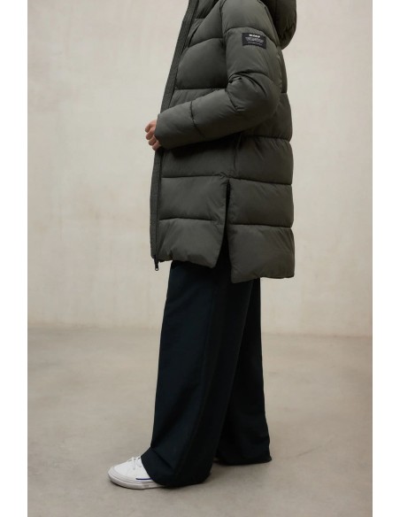 Presenta un corte relajado y largo por encima de la rodilla, perfecto para el día a día. Incorpora capucha ajustable con topes, puños internos elásticos y un cierre frontal con cremallera bidireccional que aporta comodidad. Los bolsillos frontales horizontales con cremallera y las aberturas laterales con cremallera invisible aportan practicidad y diseño.
