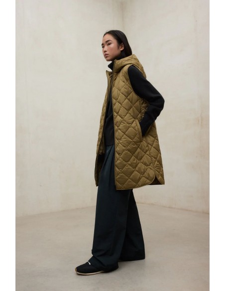 La prenda interior, acolchada en rombos, tiene un ajuste regular, cierre frontal con cremallera bidireccional, aberturas laterales y bolsillos tipo jet, ofreciendo practicidad y abrigo extra.