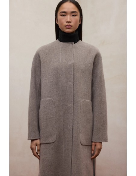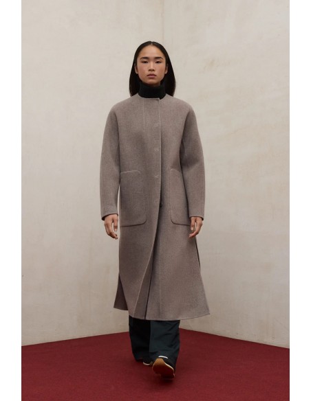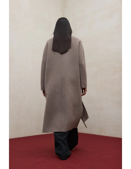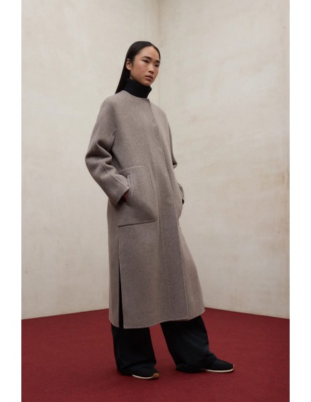 Su diseño presenta un cuello redondo con pinzas, cierre cruzado con tapeta de botones ocultos y bolsillos tipo ojal en el frente que aportan practicidad y un acabado sofisticado. Las costuras hechas a mano y las aberturas laterales refuerzan su carácter artesanal y refinado.