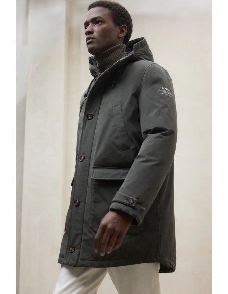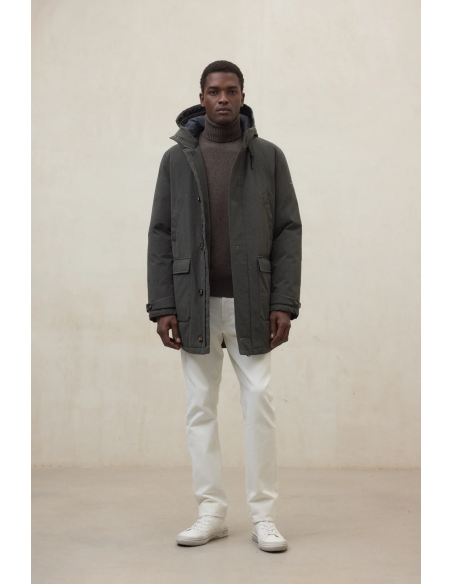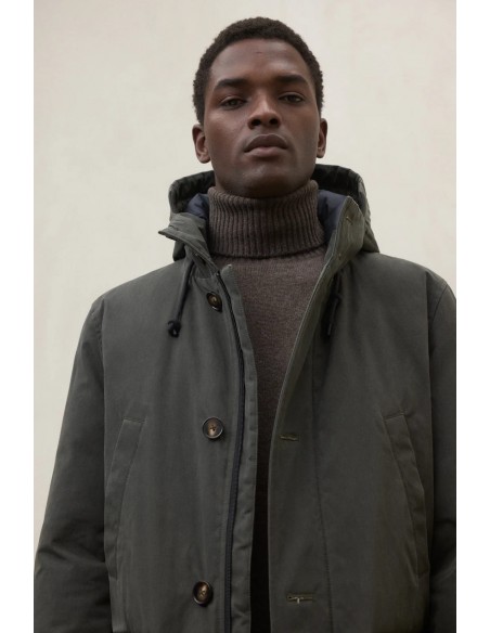 El abrigo Taska Verde Oscuro de Ecoalf combina sostenibilidad, funcionalidad y estilo urbano. Confeccionado con 54% poliéster reciclado y 46% algodón orgánico, forro 100% poliéster reciclado y relleno THERMOLITE® reciclado, reutiliza residuos plásticos y textiles, promoviendo la economía circular y reduciendo el impacto ambiental.