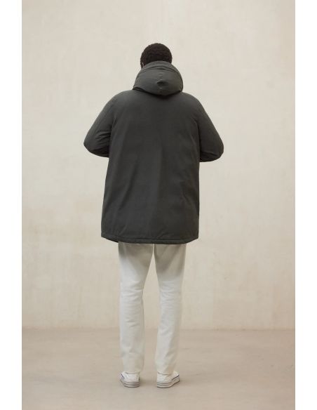 Su ajuste regular y largo 3/4 ofrece comodidad y libertad de movimiento. Incorpora tapeta frontal con botones personalizados, bolsillos frontales con solapa y bolsillos de pecho, además de capucha ajustable con cordones y tapetas en los puños. Detalles de marca, bajo con cola y teñido de prenda completan su diseño urbano y moderno.