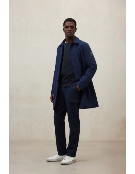 El abrigo Hampshire Azul Marino de Ecoalf combina sostenibilidad, confort y estilo urbano. Confeccionado con 55% poliéster reciclado Tex2Tex y 45% Hilo del mar, y relleno 100% poliéster reciclado, reutiliza botellas y residuos oceánicos, promoviendo la economía circular y reduciendo el impacto ambiental.