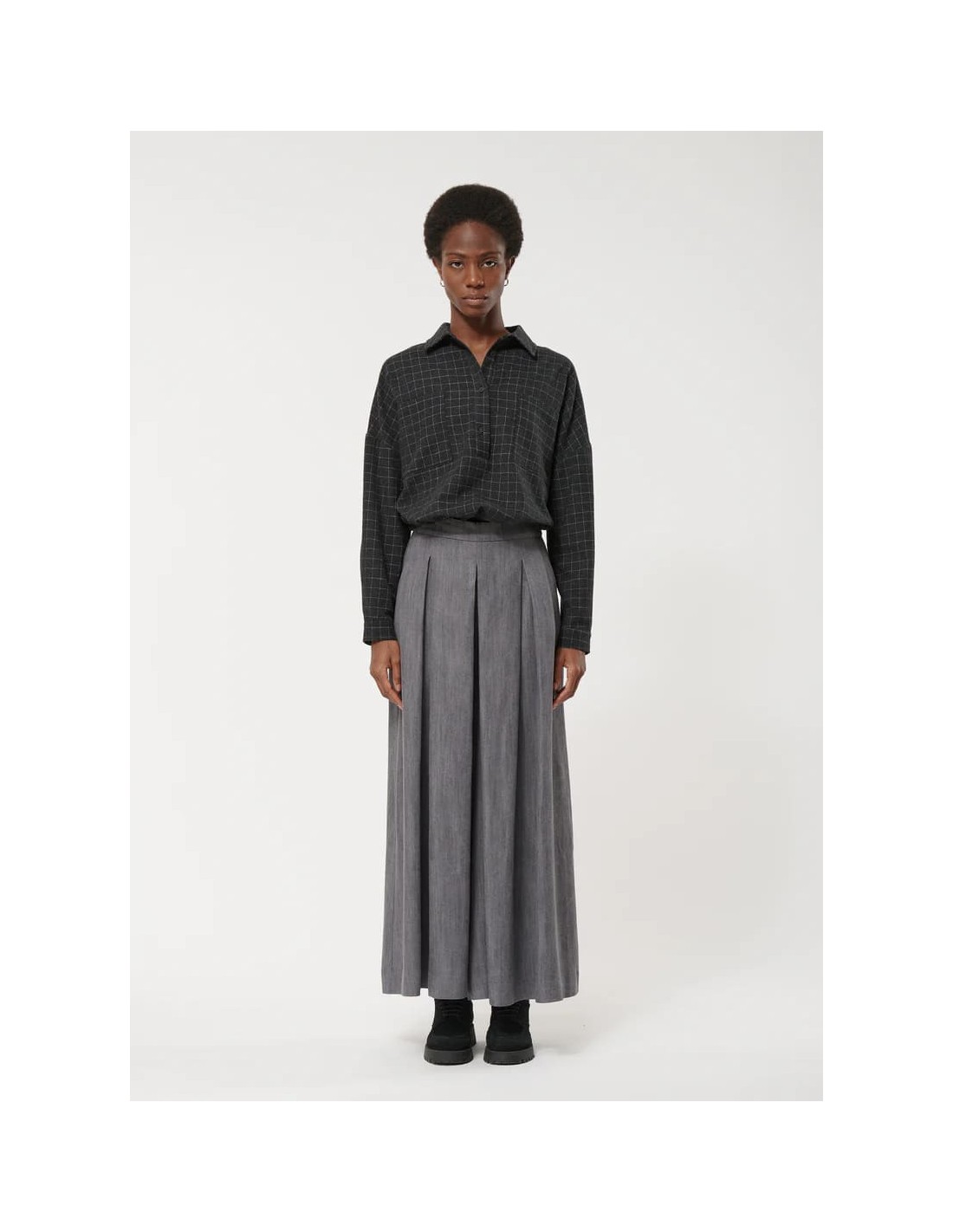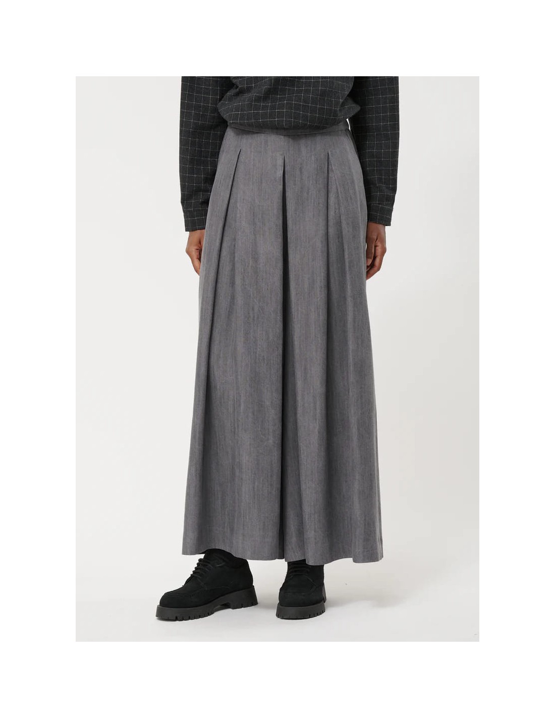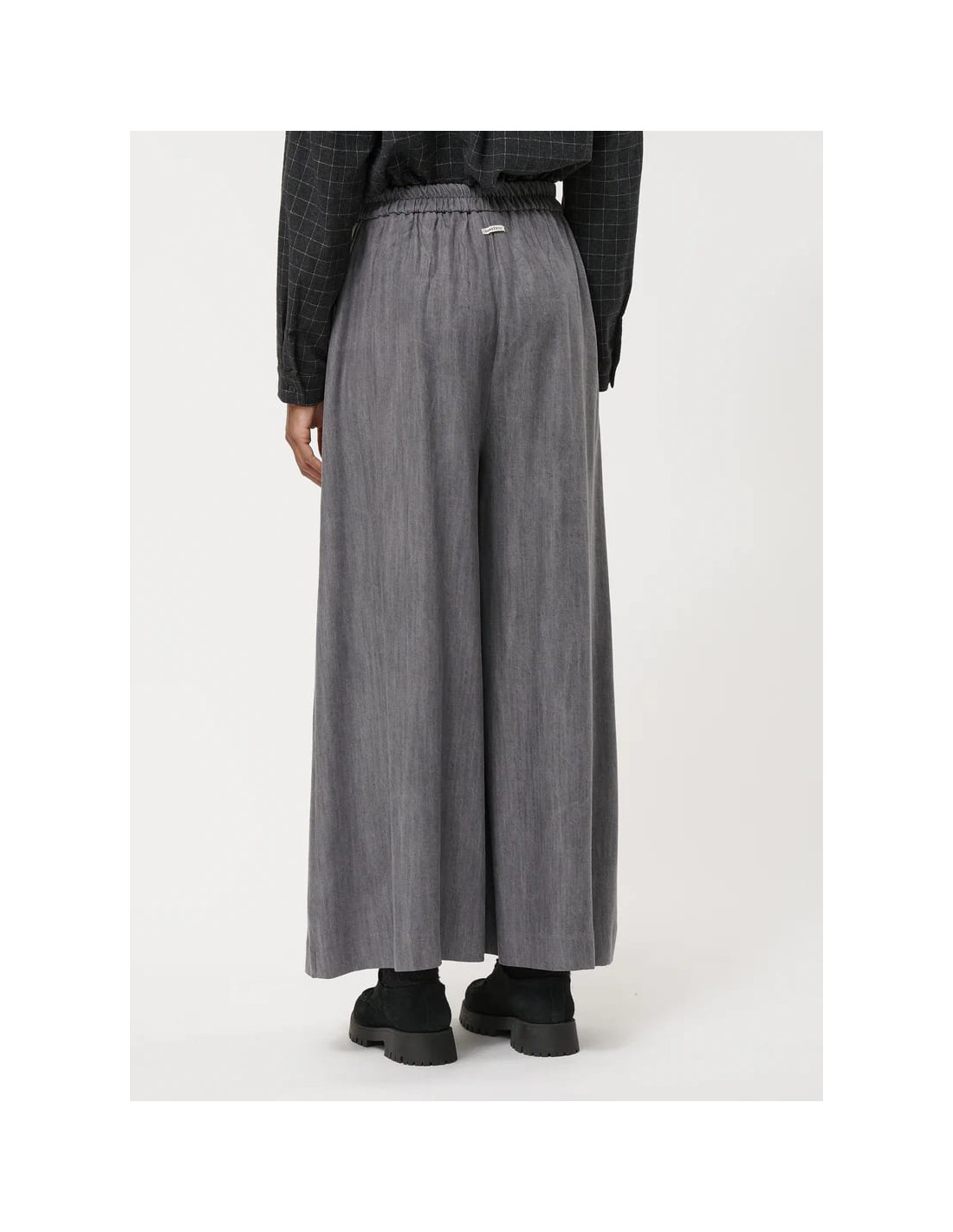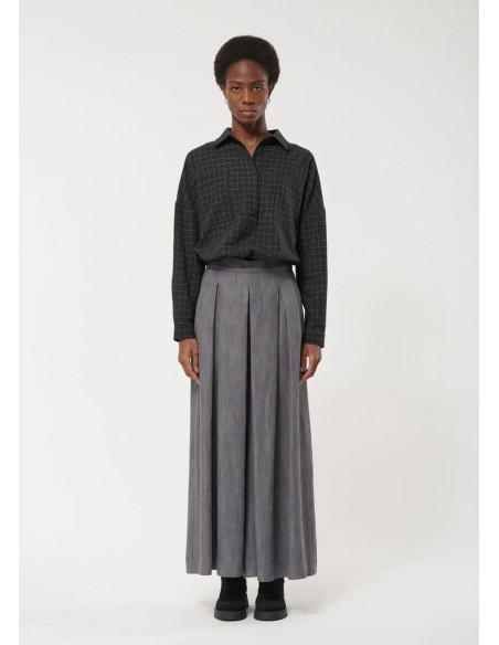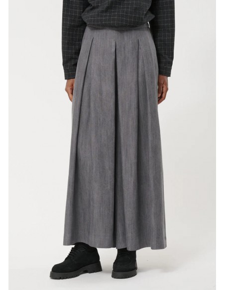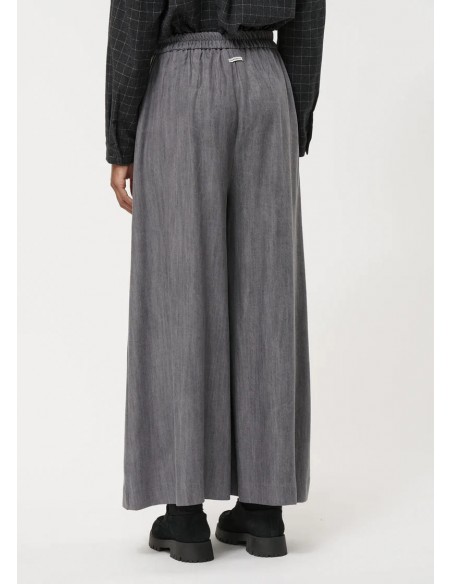El Pantalón Falda Culotte Gris de Humility combina elegancia, confort y sostenibilidad en una silueta moderna y fluida. Confeccionado en 100% lyocell, un material ecológico y transpirable, este culotte ofrece suavidad al tacto y un fluido movimiento que se adapta al cuerpo.