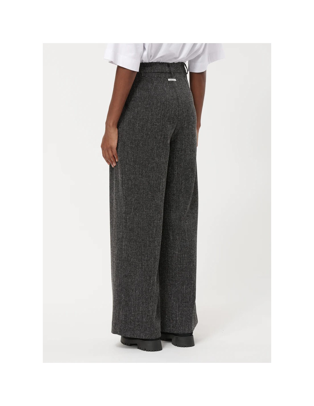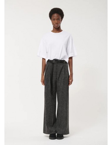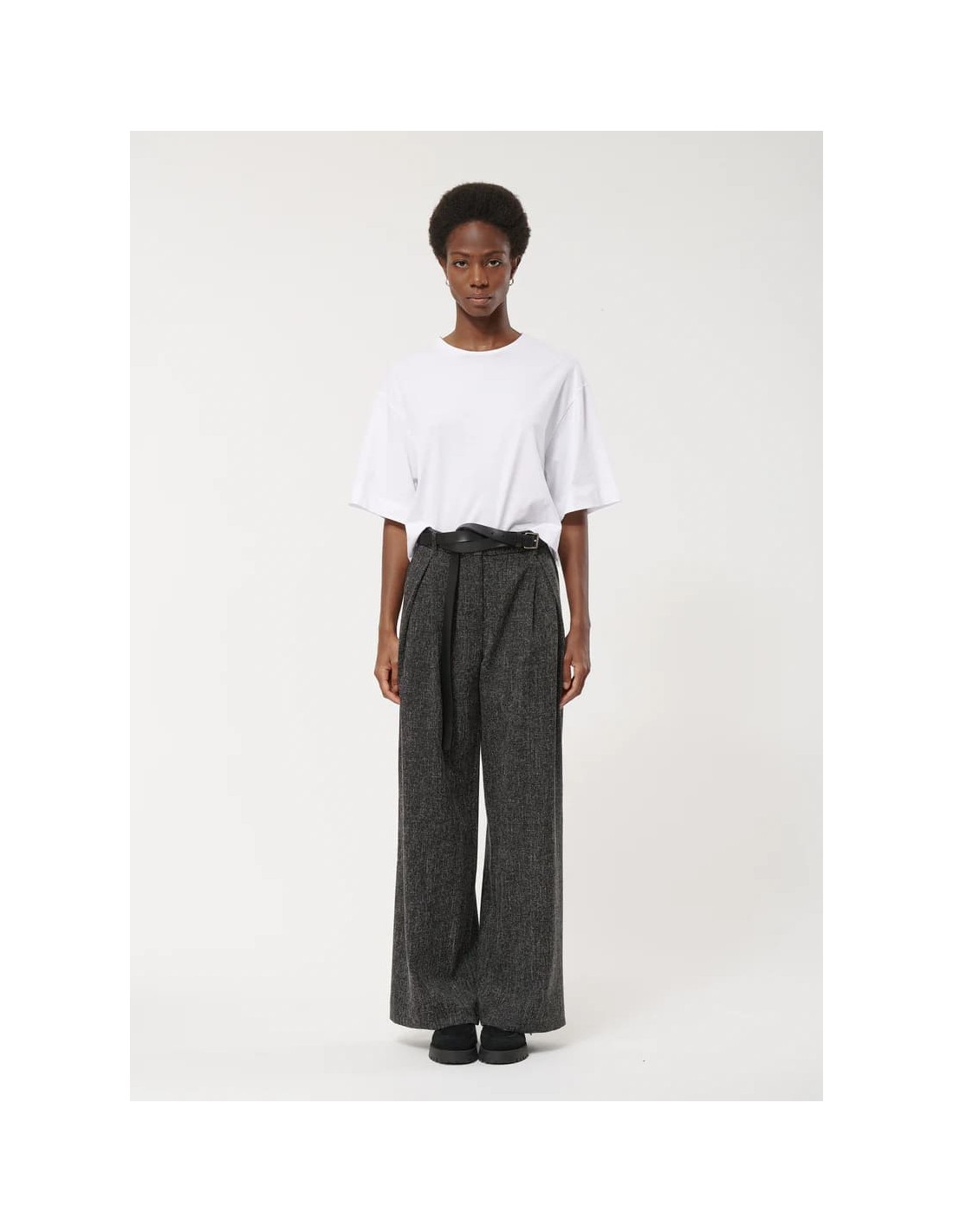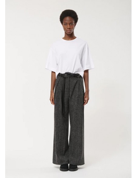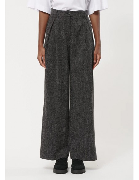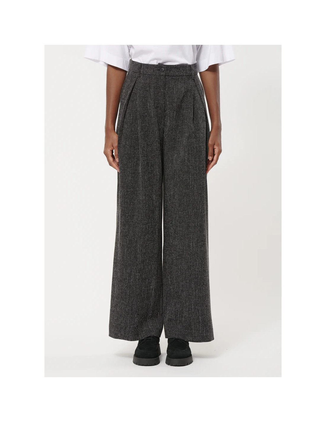 El Pantalón Ancho Gris Jaspeado de Humility combina elegancia clásica y comodidad moderna. Con un corte recto y pliegues frontales marcados, aporta estructura y sofisticación a cualquier look, mientras que la cintura alta con cinturón y trabillas asegura un ajuste perfecto y estilizado.