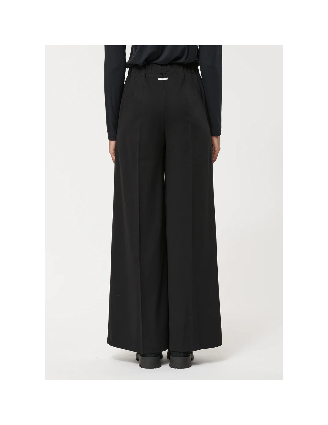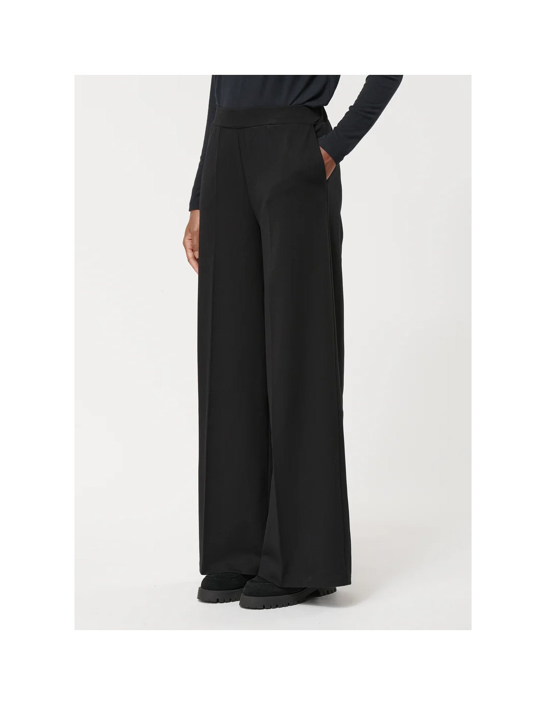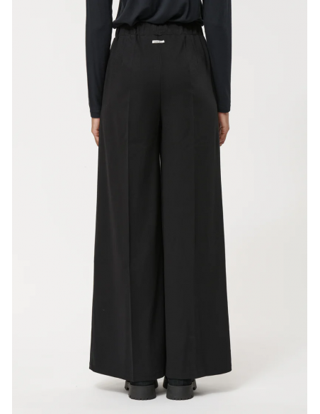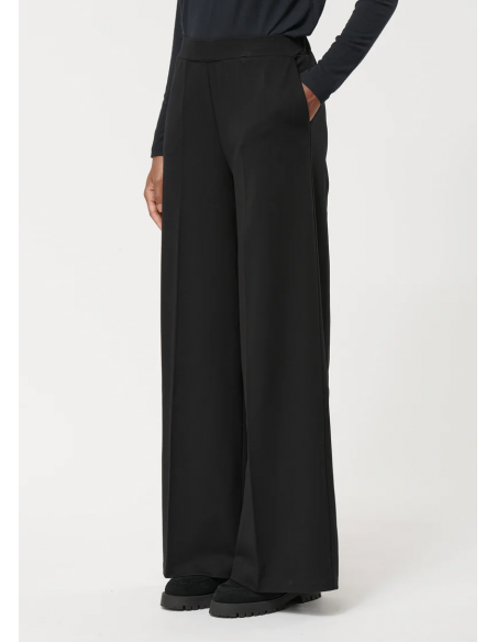 El pantalón ancho negro en Milano stretch es una prenda versátil que combina comodidad y elegancia. Confeccionado en jersey Milano de viscosa y poliamida con elastano, ofrece un ajuste flexible y una caída impecable.